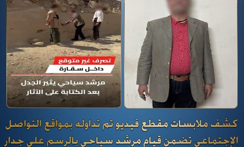 كشفت وزارة الداخلية تفاصيل واقعة أثارت جدلًا واسعًا، بعد تداول مقطع فيديو يظهر مرشدًا سياحيًا وهو يقوم بالرسم على جدار أحد الآثار بمنطقة سقارة في الجيزة، بغرض الشرح لمجموعة من السائحين.