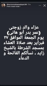 وكتب محمد سامي عبر حسابه على إنستجرام: عزاء والد زوجتى عمر بدر أبو هاني يوم الجمعة الموافق 27 فبراير بعد صلاة العشاء بمسجد الشرطة بالشيخ زايد، نسألكم الفاتحة والدعاء.