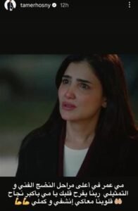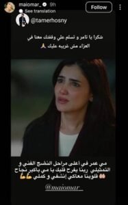 ونشر تامر حسني عبر خاصية القصص القصيرة في حسابه على الانستجرام صورة لمي عمر من المسلسل وكتب: “مي عمر في أعلى مراحل النضج الفني والتمثيلي ربنا يفرح قلبك يا مي بأكبر نجاح، قلوبنا معاكي انشفي وكملي”.