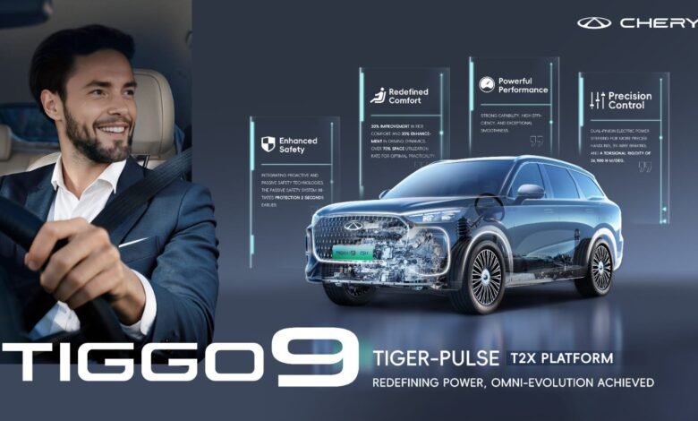 تمثل منصة Tiger-Pulse T2X العمود الفقري لتفوق TIGGO9 CSH، حيث توفر توازنًا مثاليًا بين الأداء، التحكم، السلامة، الراحة والمساحة. تتميز السيارة بتوجيه كهربائي مزدوج الدقة ونظام فرامل بالأسلاك، مما يتيح تحكمًا سلسًا ومرونة فائقة على الطرق الحضرية والتضاريس الوعرة.