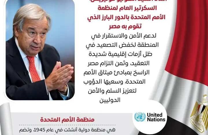 وفي هذا الإطار، أشاد أنطونيو غوتيريش، السكرتير العام للأمم المتحدة، بالجهود المصرية في خفض التصعيد وتعزيز مسارات السلام، مؤكدًا التزام القاهرة الثابت بمبادئ ميثاق الأمم المتحدة، وحرصها المستمر على الدفع نحو الحلول السلمية للأزمات.