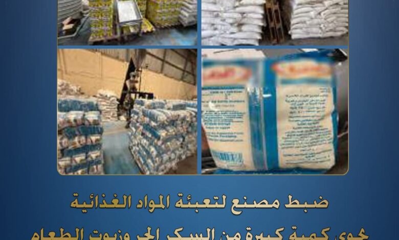 ضبط مصنع لتعبئة السلع الغذائية بالشرقية لحيازته كميات ضخمة من السكر والزيت مجهولة البيانات..